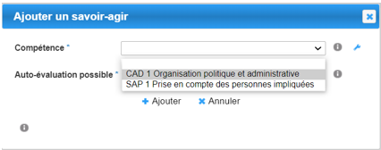 En cliquant sur « Ajouter », un formulaire demande de sélectionner la compétence évaluée. La liste proposée est issue d’un écran de paramétrage abordé ultérieurement dans cette procédure. De plus, ce formulaire permet aussi de définir si l’auto-évaluation doit être possible.