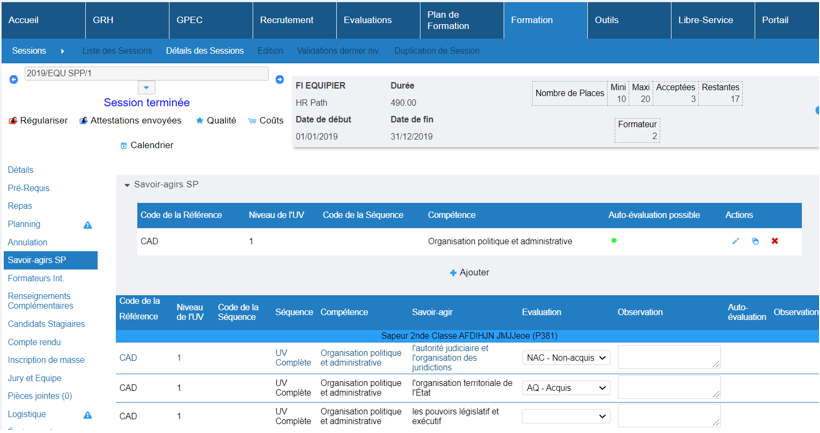 Les savoir-agirs sont issus d’une évaluation permettant de déterminer si les stagiaires ont pu acquérir des compétences liées à la session suivies. Les évaluateurs se prononcent sur chacune des compétences paramétrées, mais il est également possible pour les stagiaires de s’auto-évaluer.