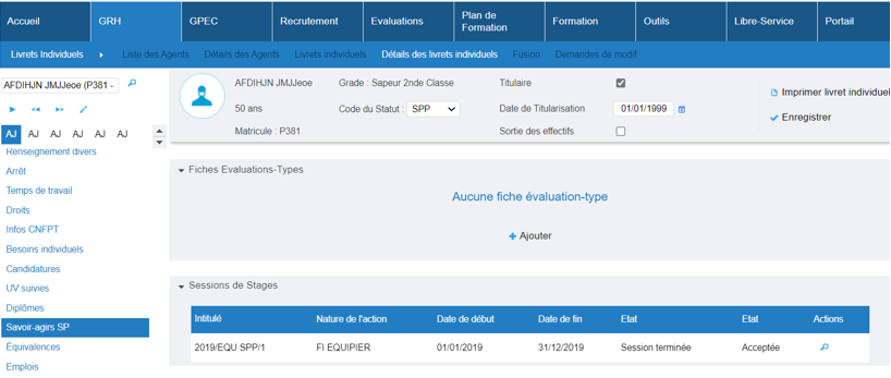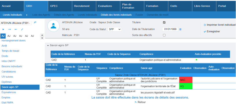 Les résultats des évaluations peuvent être visualisé dans l’écran « GRH > Livrets Individuels > Détails des livrets individuels » :