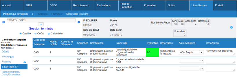 Dans le Libre-Service, l’écran « Libre-Service > Postuler aux formations > Détails des sessions » permet aux stagiaires de s’auto-évaluer. Ils peuvent prendre connaissance de l’évaluation des formateurs, mais également se prononcer sur leur propre apprentissage et y ajouter des observations.