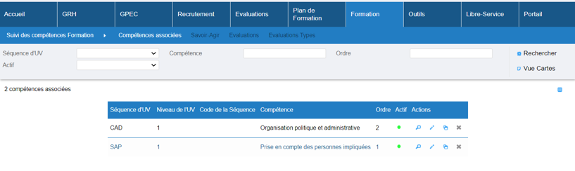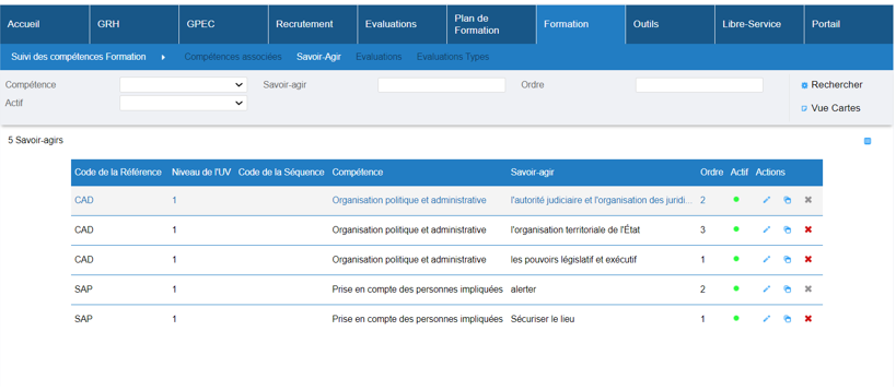 Pour chaque compétence paramétrée, il faut ensuite créer les savoir-agirs via l’écran « Formation > Suivi des compétences Formations > Savoir-Agir ».