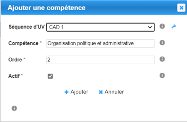 - Séquence d’UV : permet de sélectionner l’UV dont une compétence doit être évaluée ;