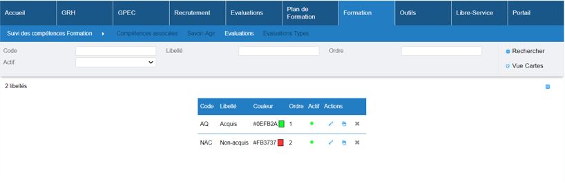 Ces évaluations sont caractérisées par un code, un libellé, une couleur et un ordre.