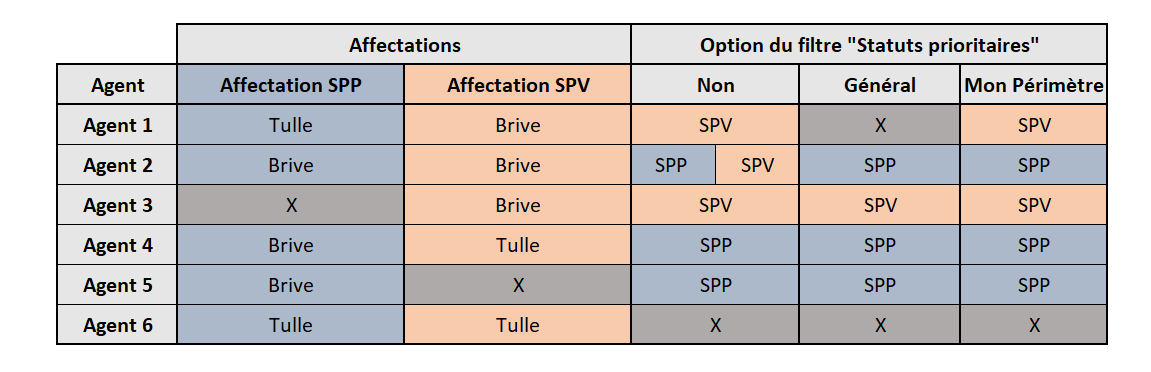 Général : seul le statut avec la plus haute priorité est sélectionné, s’il n’appartient pas à mon périmètre, l’agent ne ressort pas.