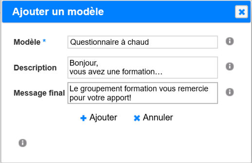 Cet écran permet de créer un modèle de courriel, qui sera utiliser ici pour l’envoi et/ou la relance du questionnaire.