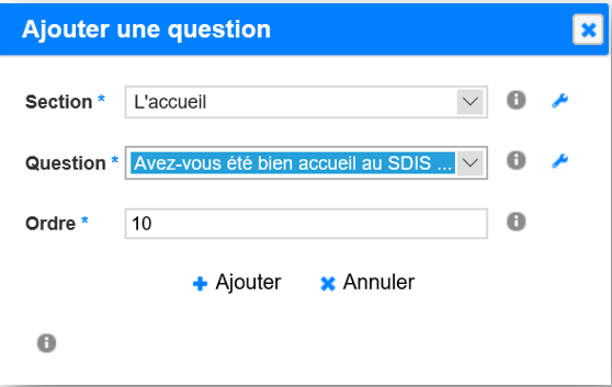 Après avoir sélectionné la question dans la liste déroulante, il faudra indiquer un ordre d’affichage. Il est recommandé d’utiliser des paliers de 10 pour permettre d’ajouter des questions par la suite.