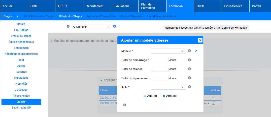 Associer les modèles avec les stages (facultatif): Formation > Stages > Détails > Qualité;