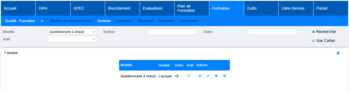 Vous pouvez notamment dupliquer une section existante en cliquant sur le bouton prévu à cet effet. En cliquant sur la loupe , vous accédez au détail de la section, soit à la partie “Questions”.