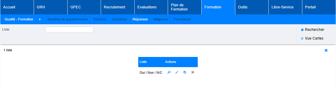 Créer les listes de réponses: Formation > Administration > Qualité – Formation > Réponses (sans oublier le bouton « détail ») ;