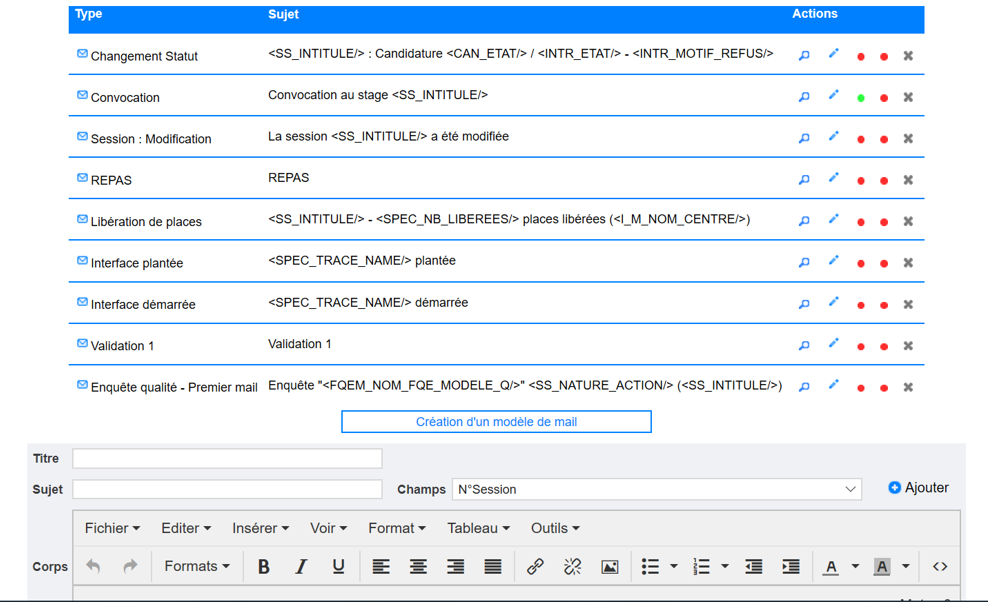 Créer les modèles de courriels: Administration > Modèles > Courriels