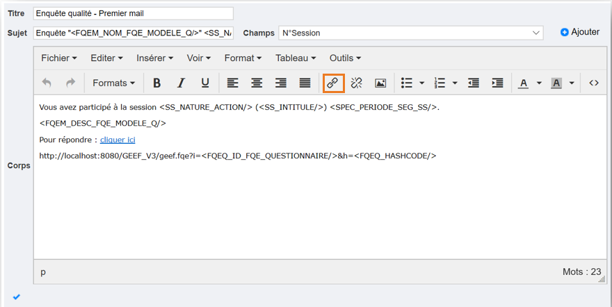 Ce mail devra également contenir le lien d’accès au questionnaire, qui doit être construit de la manière suivante: