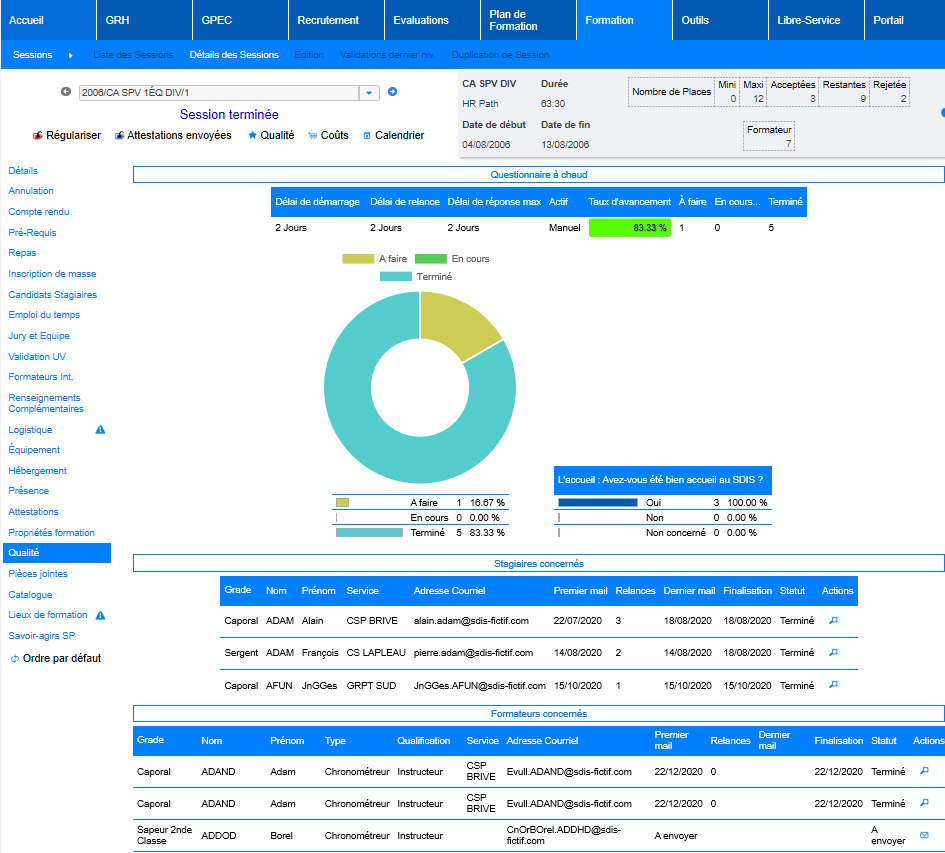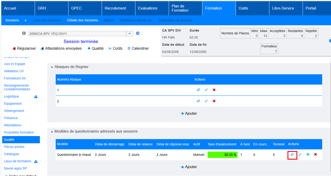 Envoyer les invitations à répondre, attendre les réponses, puis consulter les résultats: Formation > Sessions > Détails > Qualité