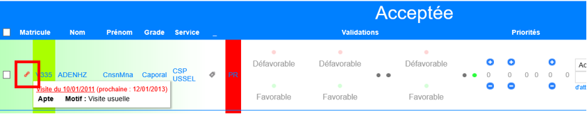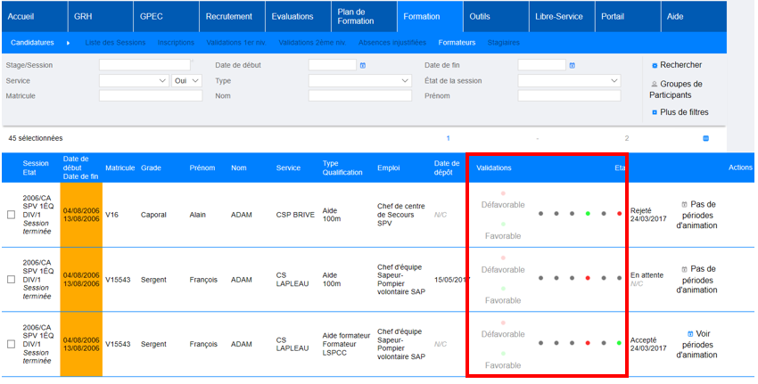 Un écran supplémentaire permet de valider hiérarchiquement les candidatures, tous niveau confondu. Il doit obligatoirement être utilisé si plus de 3 niveaux de validation sont utilisés au sein du SDIS.