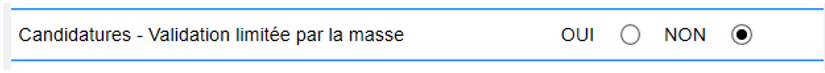 Permet de définir si les validations des candidatures sont limitées par les quotas des inscriptions de masses. Dans ce cas, le dépôt de candidature par un hiérarchique n’est plus limité par les inscriptions de masses dès lors que la session est ouverte aux libre-service, cependant le responsable hiérarchique ne peut pas donner d’avis favorable à plus d’agent que de place lui sont réservées sur la session.