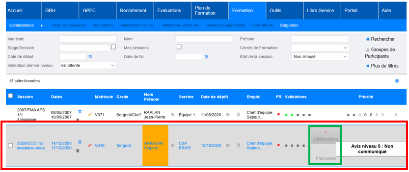 Dans l’écran Formation > Sessions > Validations dernier niveau: