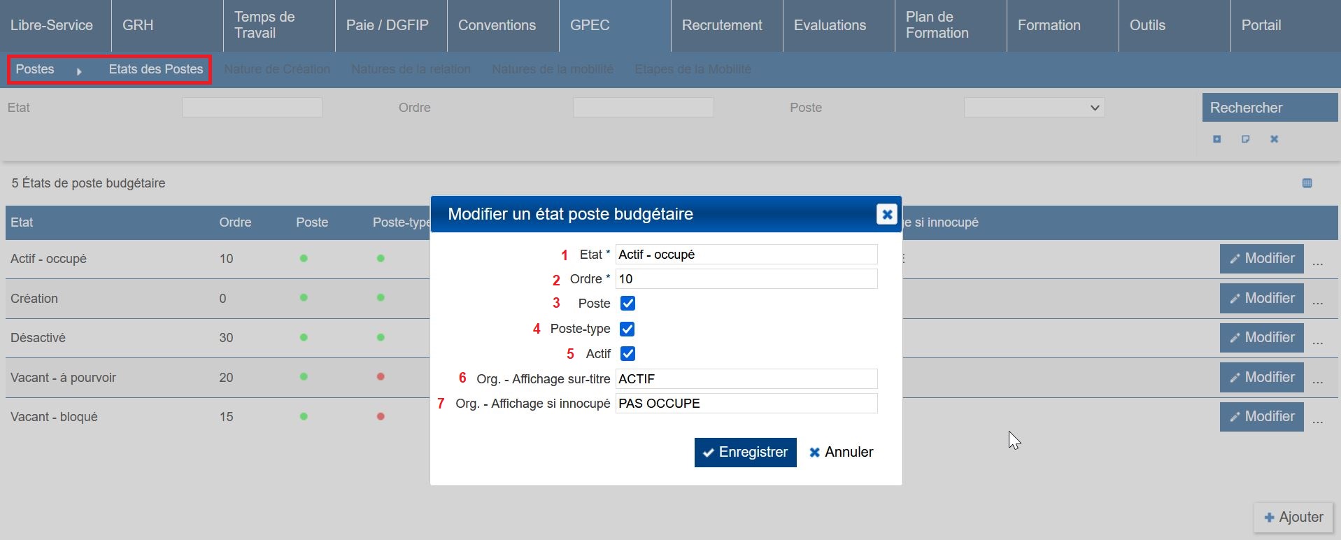 Actif : Si coché permet d’indiquer que le poste dans cet état est actif ou non. Lors de la création d’un poste/poste-type, c’est le premier état (par l’ordre) qui est automatiquement sélectionné, que l’état soit coché “Actif” ou non (5)