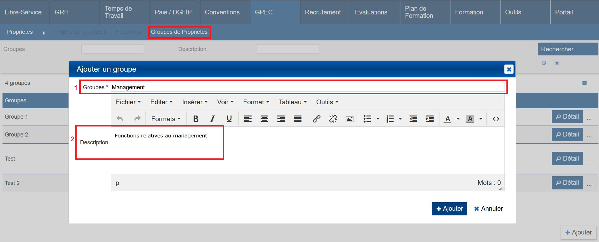 2- Dans “GPEC / Administration > Propriétés > groupe de propriétés”, ajouter un groupe de propriété (facultatif).