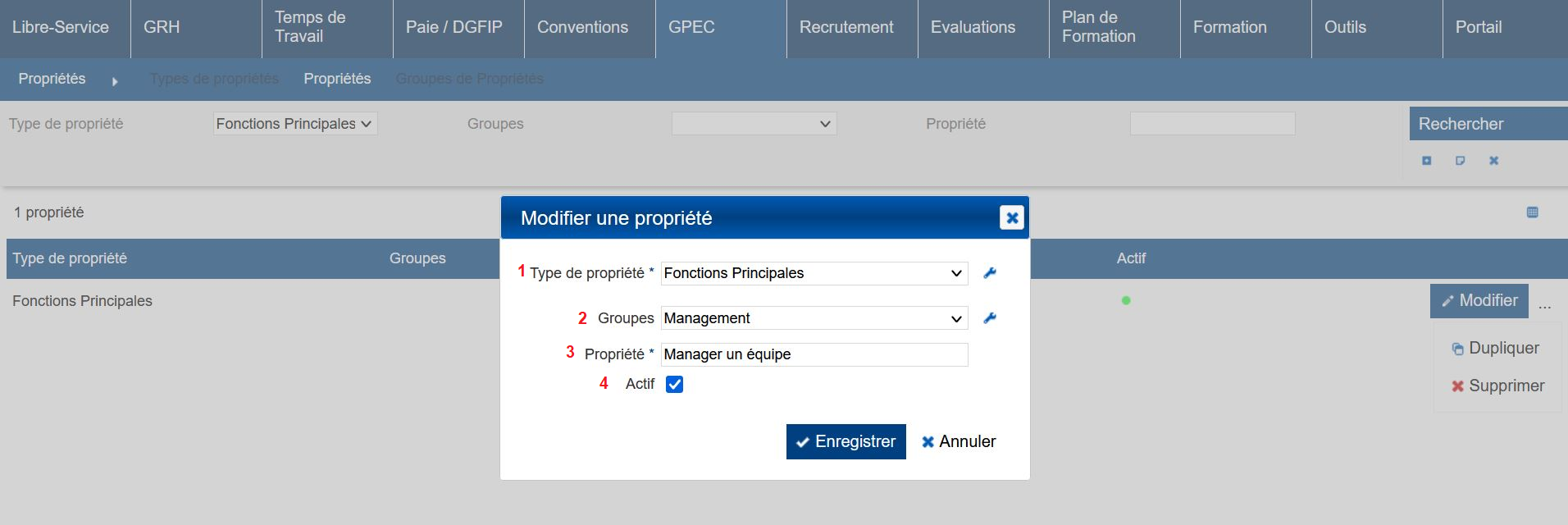 3- Dans “GPEC / Administration > Propriétés > Propriétés”, ajouter une propriété