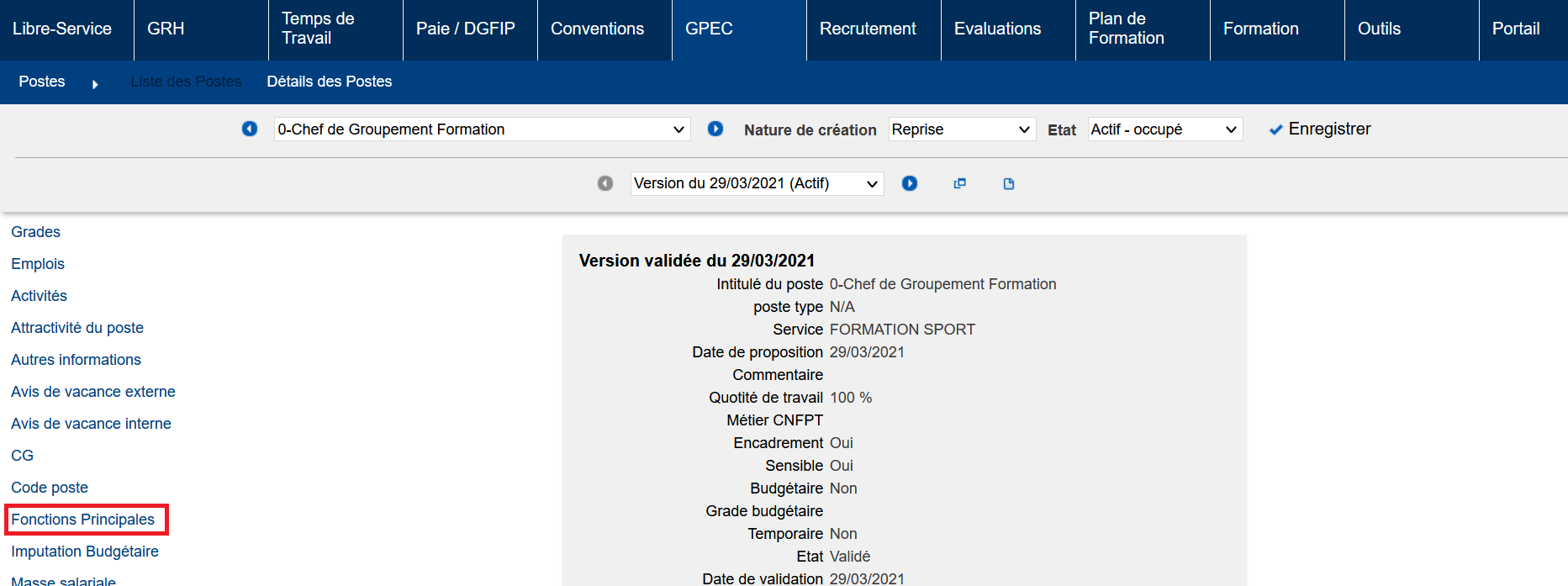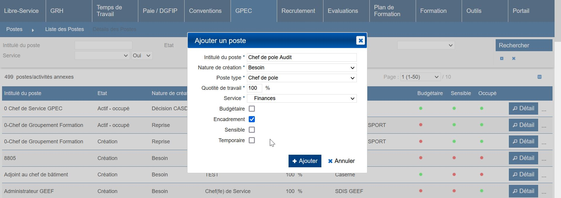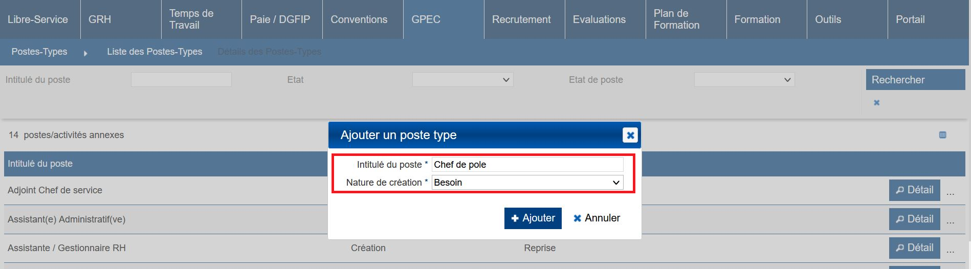 Aller dans GPEC > Postes > Liste des Postes
