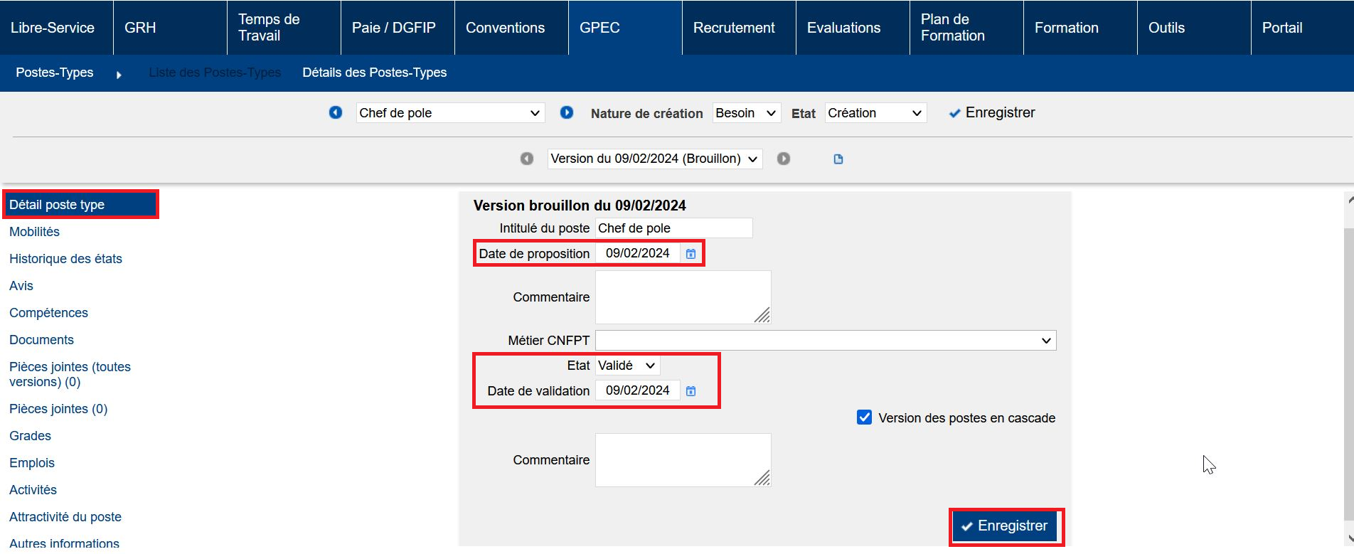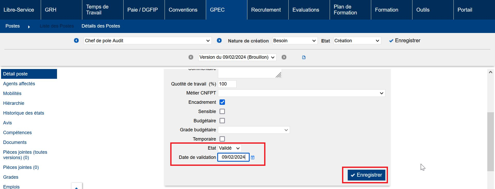5- Dans l’onglet “Détail”, passer la version brouillon à l’état “Valide” pour publier la version du poste. Lors du passage de la version à l’état “Valide”, une date de validation sera demandée. Par défaut la date de validation se positionne sur la date du jour, mais elle peut être mise à une date ultérieure. A noter : la date de validation du poste doit être supérieure ou égale à la date de proposition.