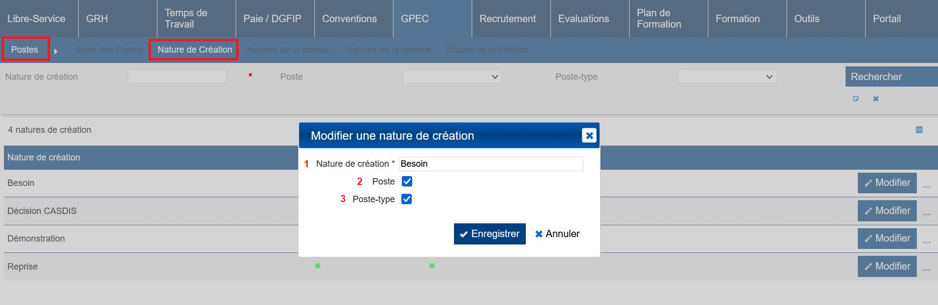 Lors de la création d’un poste-type ou d’un poste, il est obligatoire de lui attribuer une nature de création (raison pour la création du poste).