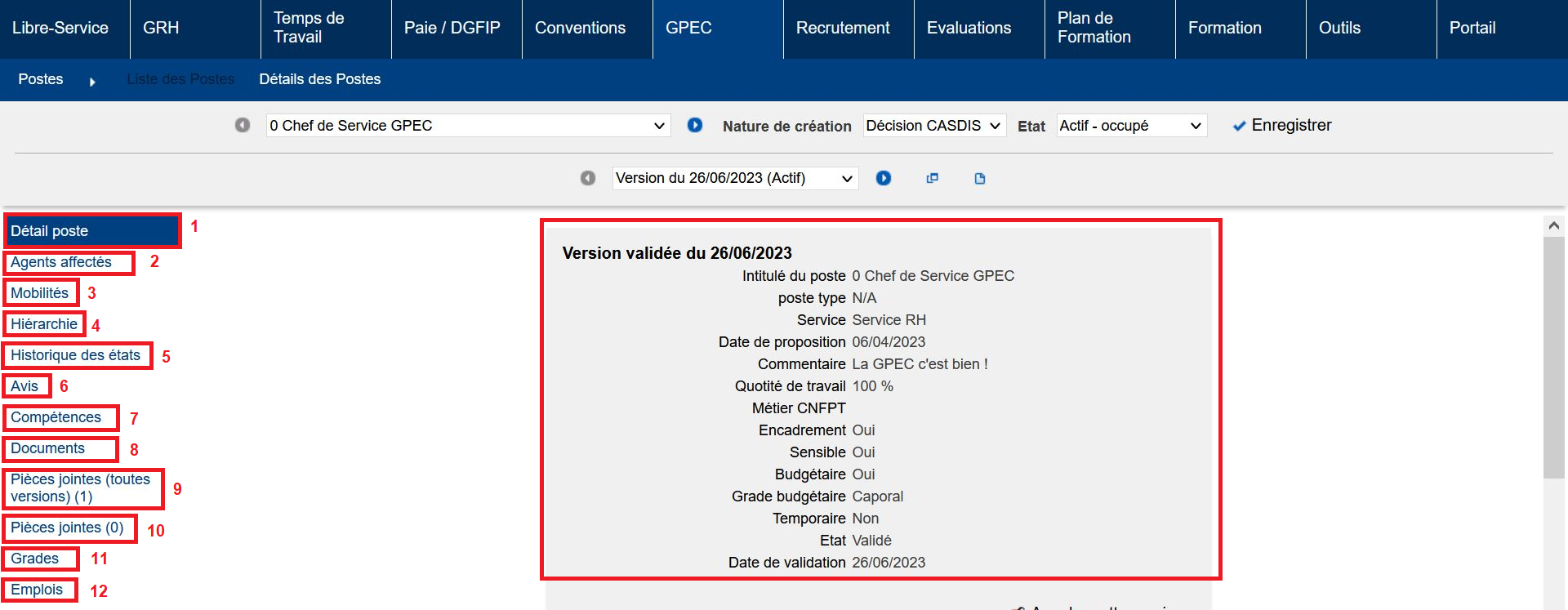 Emplois (12) : Emploi(s) rattaché(s) au poste ou poste-type. Les emplois sont ceux du référentiel disponible via “Formation / Administration > Emplois > Emplois”.