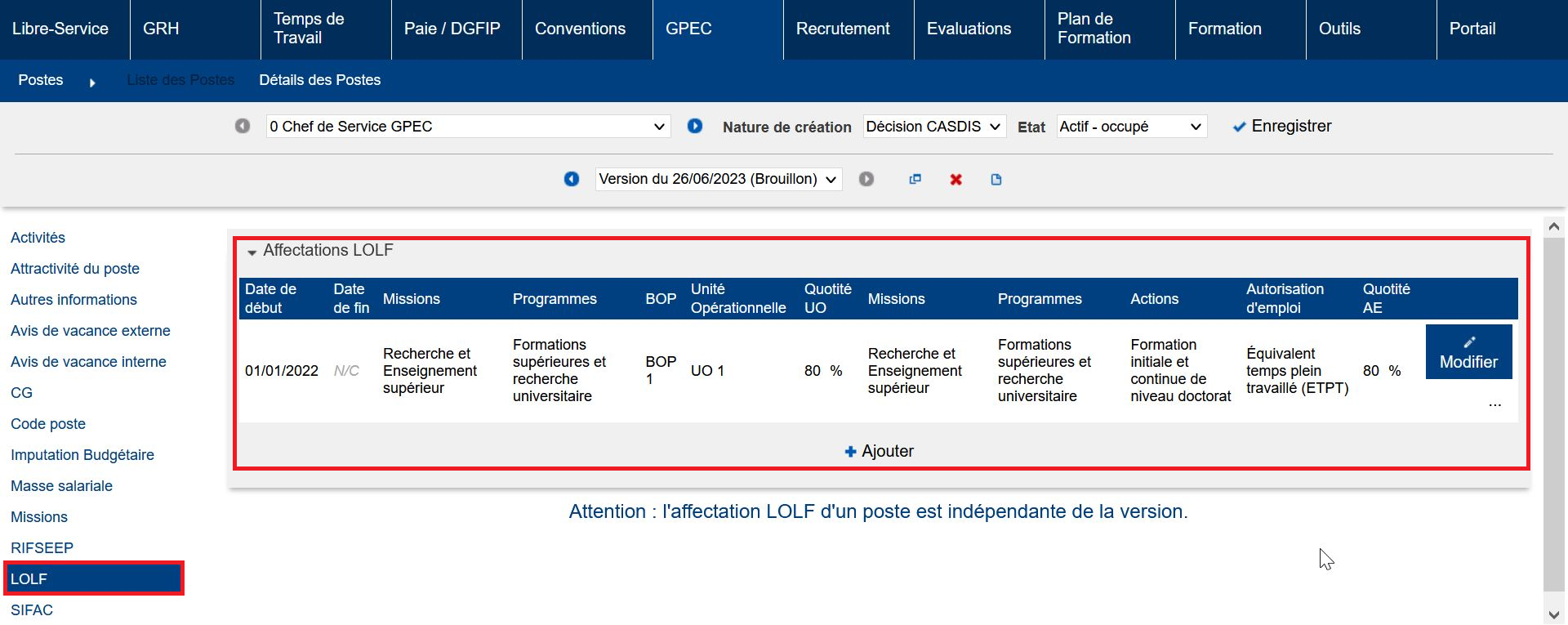 LOLF et affectations SIFAC Informations disponibles uniquement sur les Postes.