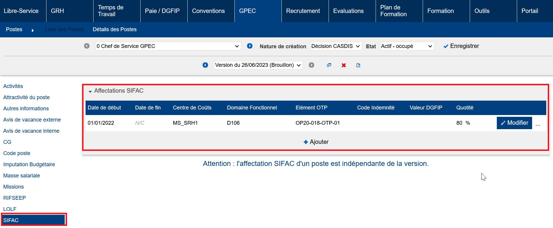 Le service du poste (via l’organigramme des services GRH / Administration > Organigrammes > Services)