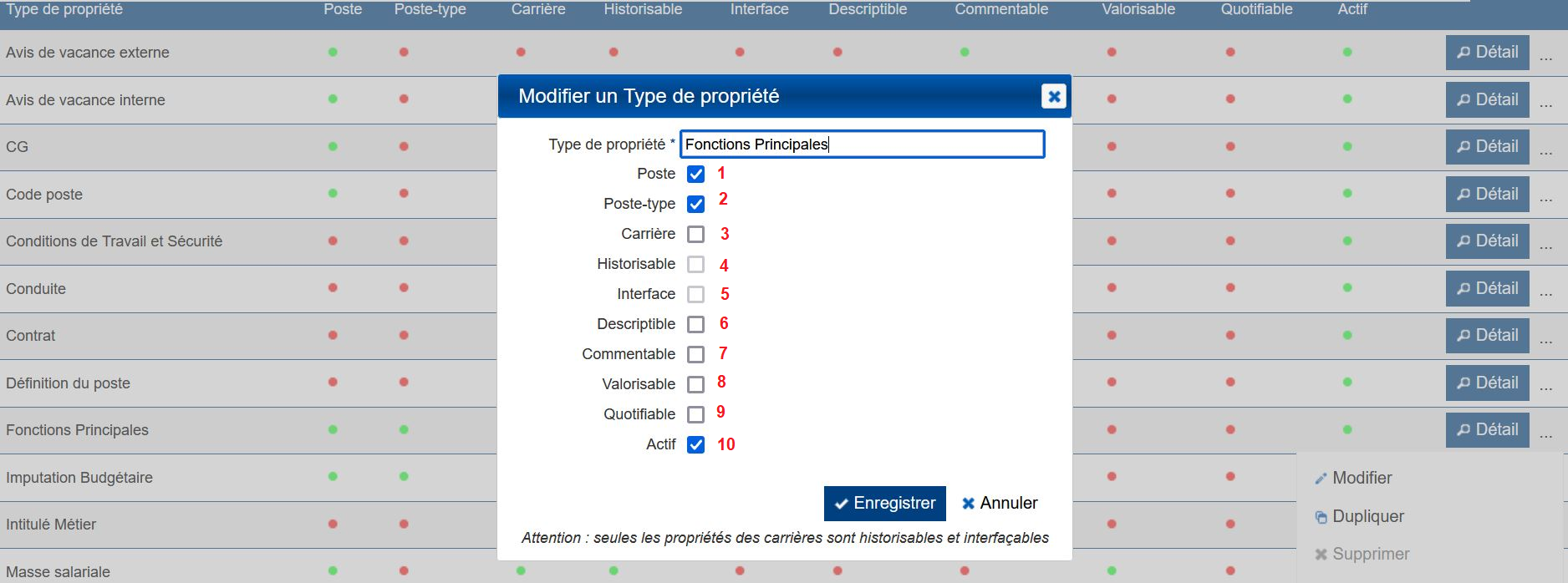 Actif (10) : si coché, le type de propriété est actif et peut être utilisé dans les carrières et/ou dans les postes/postes-types.