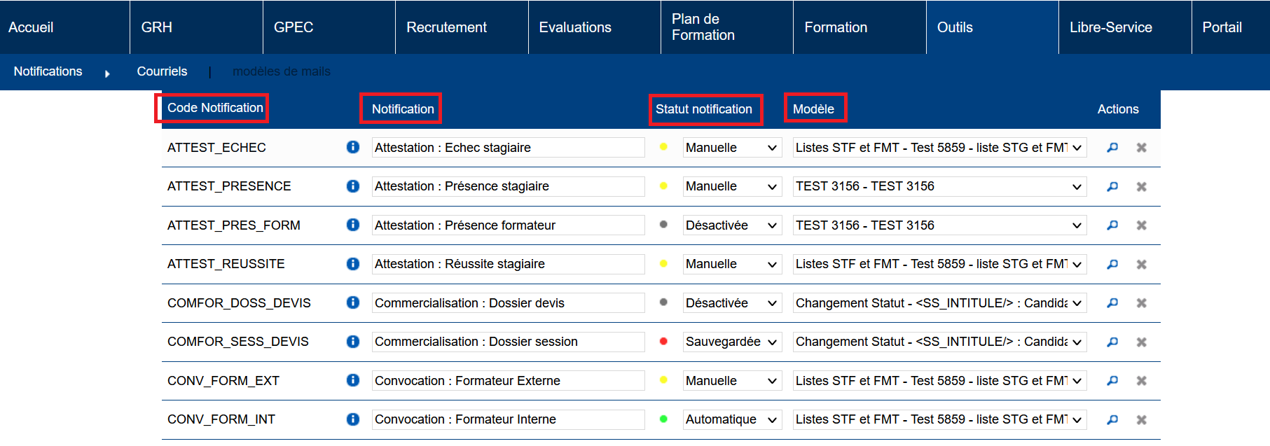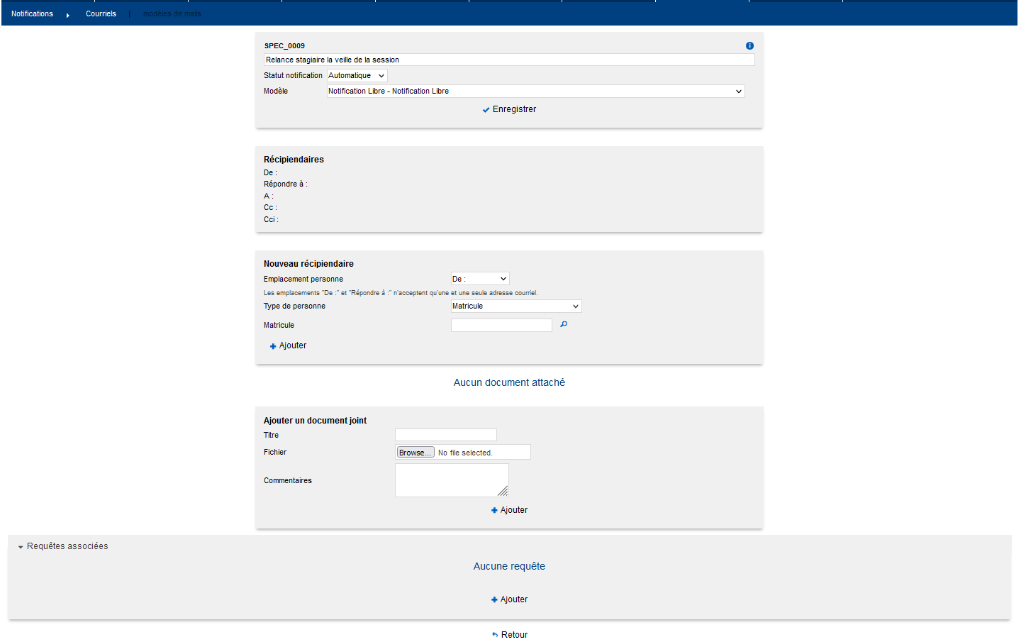 - Notification : libellé de la notification, librement modifiable dans l’écran. Le libellé sera notamment affiché dans la fonctionnalité d’audit des courriels ;