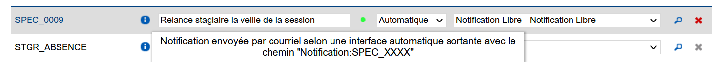 - Code Notification : les codes des notifications paramétrage suivent la nomenclature suivante : SPEC_XXXX, où XXXX est un numéro qui sera incrémenté à chaque création ;