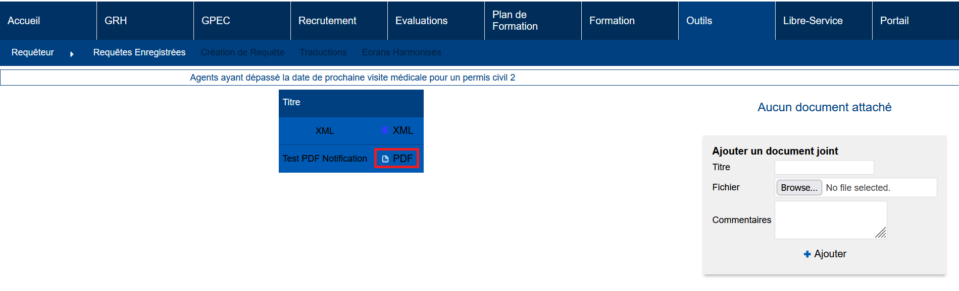 Concernant les requêtes jointes aux notifications, une fonctionnalité de l’outil Requêteur permet d’exporter un fichier test au format PDF, tel qu’il le serait dans la notification.