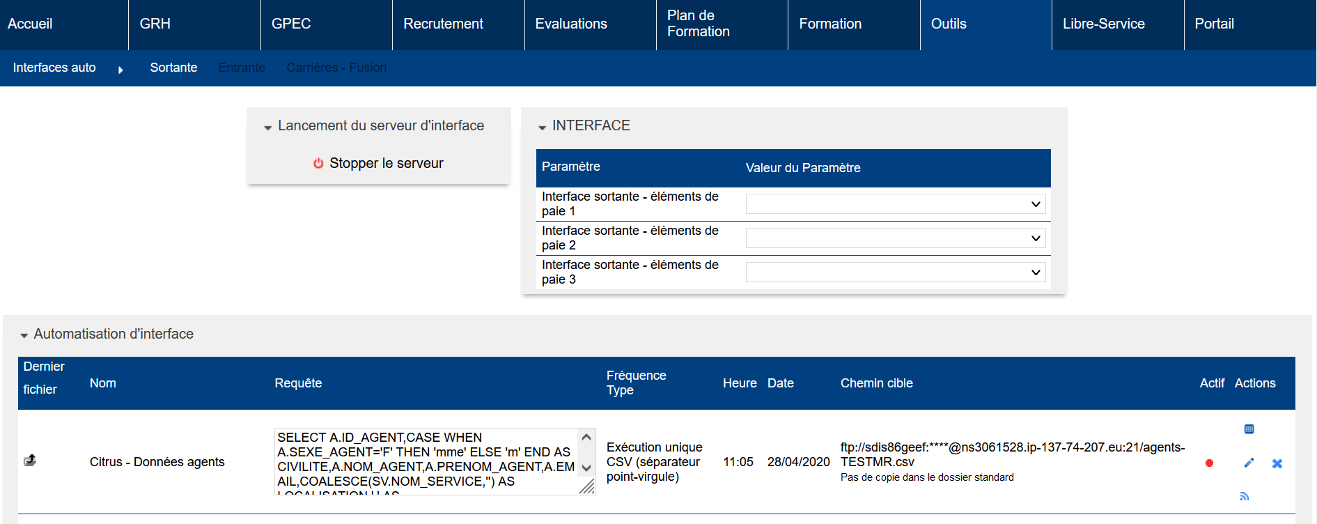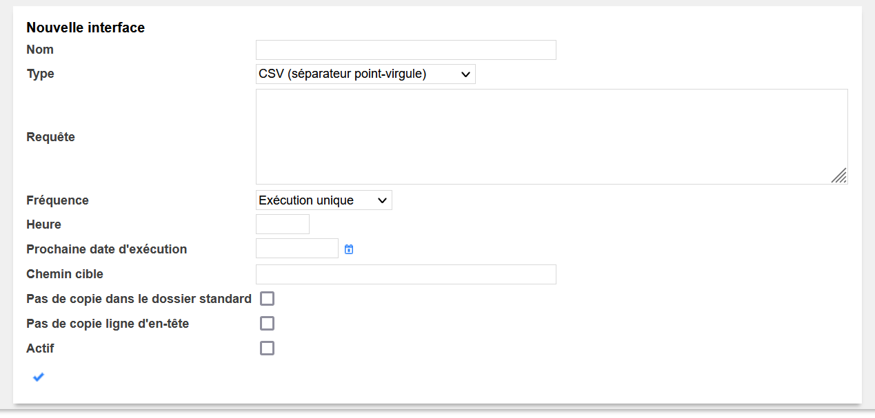 L’écran Outils > Interfaces > Sortantes permet de créer une interface automatique :
