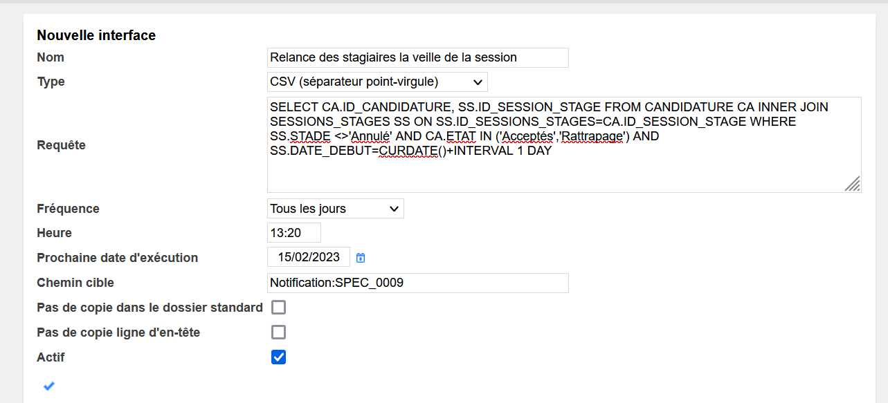 La requête présentée dans cette capture permet de générer un rappel aux stagiaires acceptés (ou « rattrapage ») sur les sessions dont la date de début est au lendemain de l’exécution de la requête. Chaque ligne résultant de la requête générera le déclenchement de la notification, cela peut donc générer un mail par agent concerné.