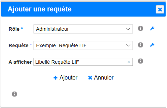 Ajouter une Requête à un rôle : à l’aide du bouton « Ajouter » en bas à droite de l’écran. Si vous souhaitez que plusieurs rôles aient accès à cette requête dans le LIF, il faudra réitérer cette action pour chacun d’entre eux.