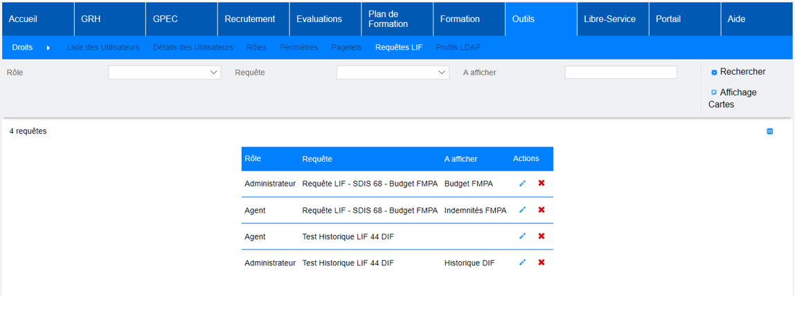 Accéder à l’écran Requête LIF : il permet d’associer les requêtes LIF à un rôle. De cette manière, le rôle définit pourra accéder à la requête directement dans le livret individuel des agents.