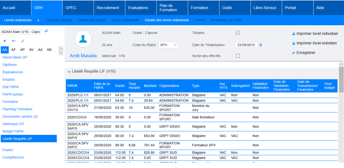 Les requêtes LIF doivent contenir un élément technique « %matricule_carriere% » permettant de définir qu’elles sont affichables dans le livret individuel des agents, ainsi qu’un élément technique « %id_session_stage% » pour leur permettre d’être affichable sur l’écran de détail des sessions de stages.