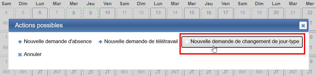 Une fenêtre s’ouvre, cliquer sur “+ Nouvelle demande de changement de jour-type”.