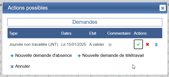 Si cette demande doit être validée, en double-cliquant dessus, il est possible de valider, refuser ou annuler cette demande si vous en avez les droits.