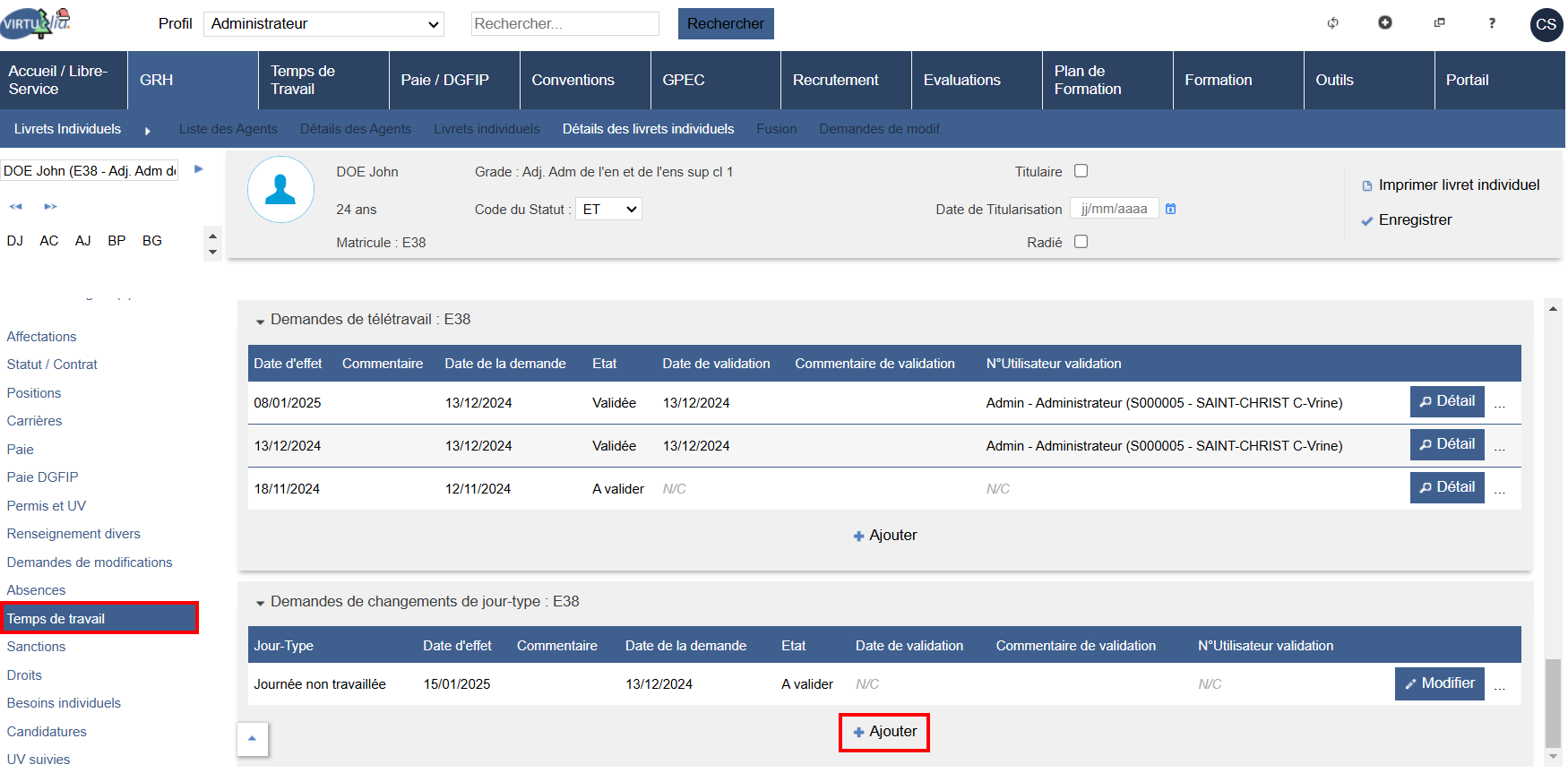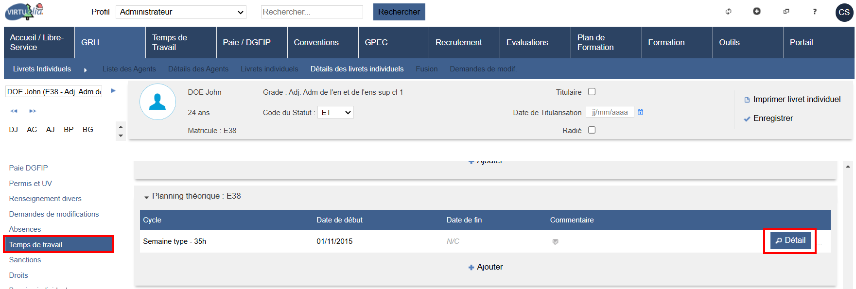 Dans GRH > Livrets individuels > Détail des livrets individuels, aller sur l’agent de votre choix.