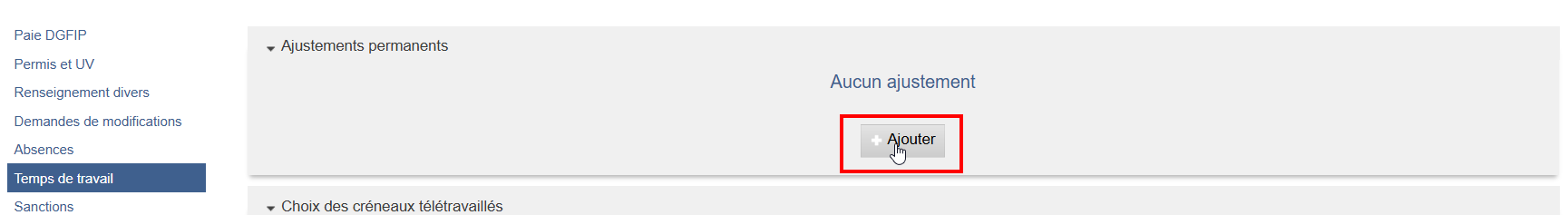 Une fois l’agent sélectionné, aller sur l’onglet Temps de travail puis cliquer sur “+ Ajouter” une demande d’ajustement.
