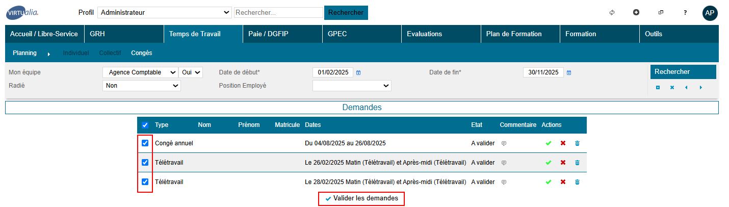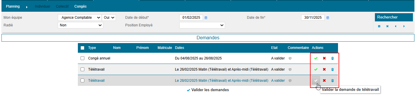 Il est également possible de valider, refuser ou annuler les demandes individuellement.
