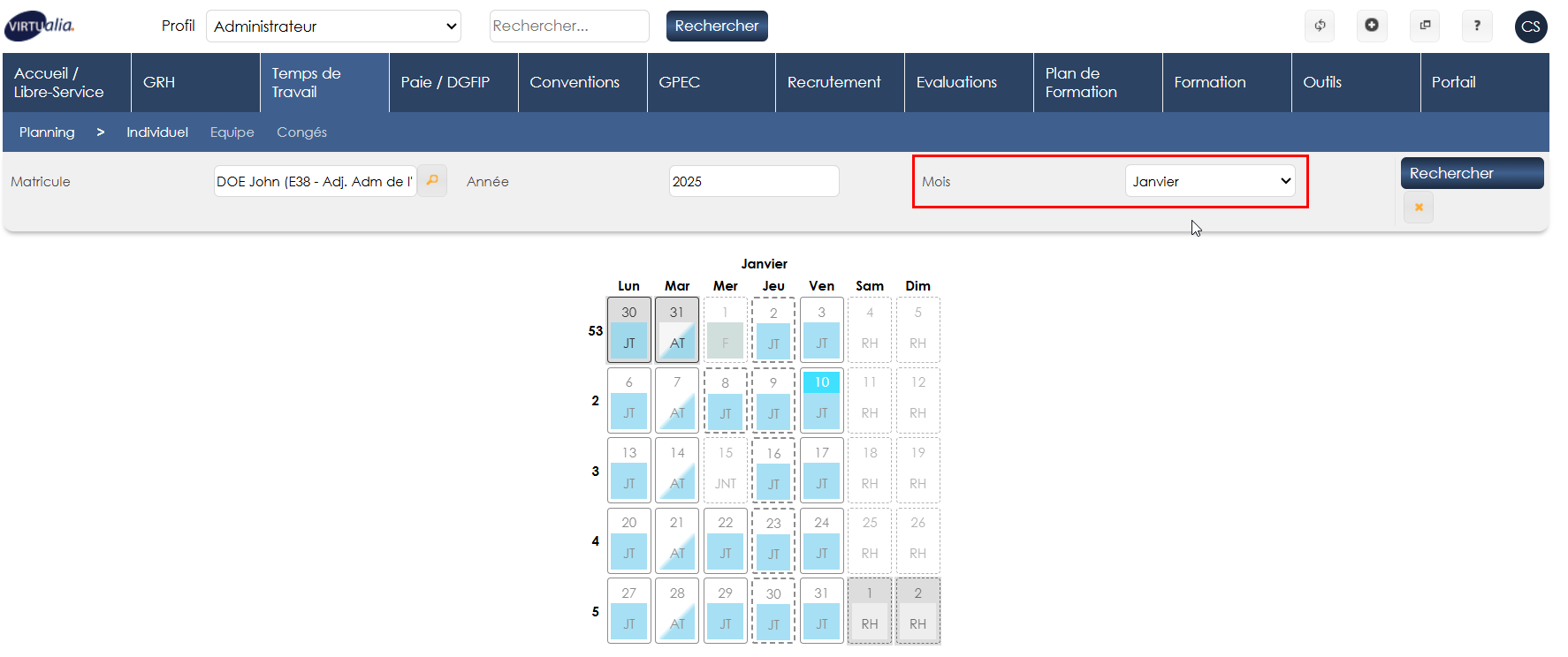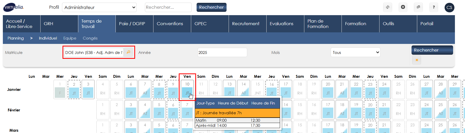 Dans Temps de travail > Planning > Individuel, aller sur l’agent de votre choix en cliquant sur “Rechercher”.