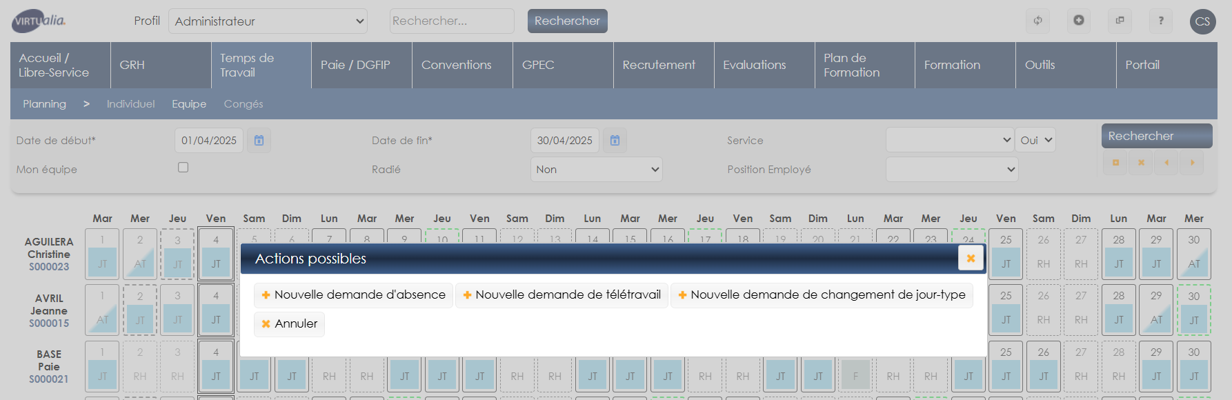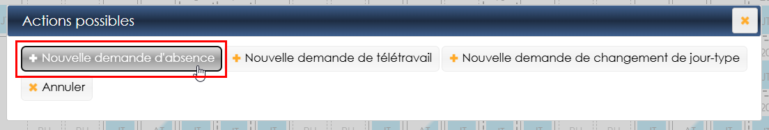 Si les droits de l’utilisateur l’autorise, il est possible de demander une absence, un télétravail ou un ajustement de planning pour un agent depuis cet écran.