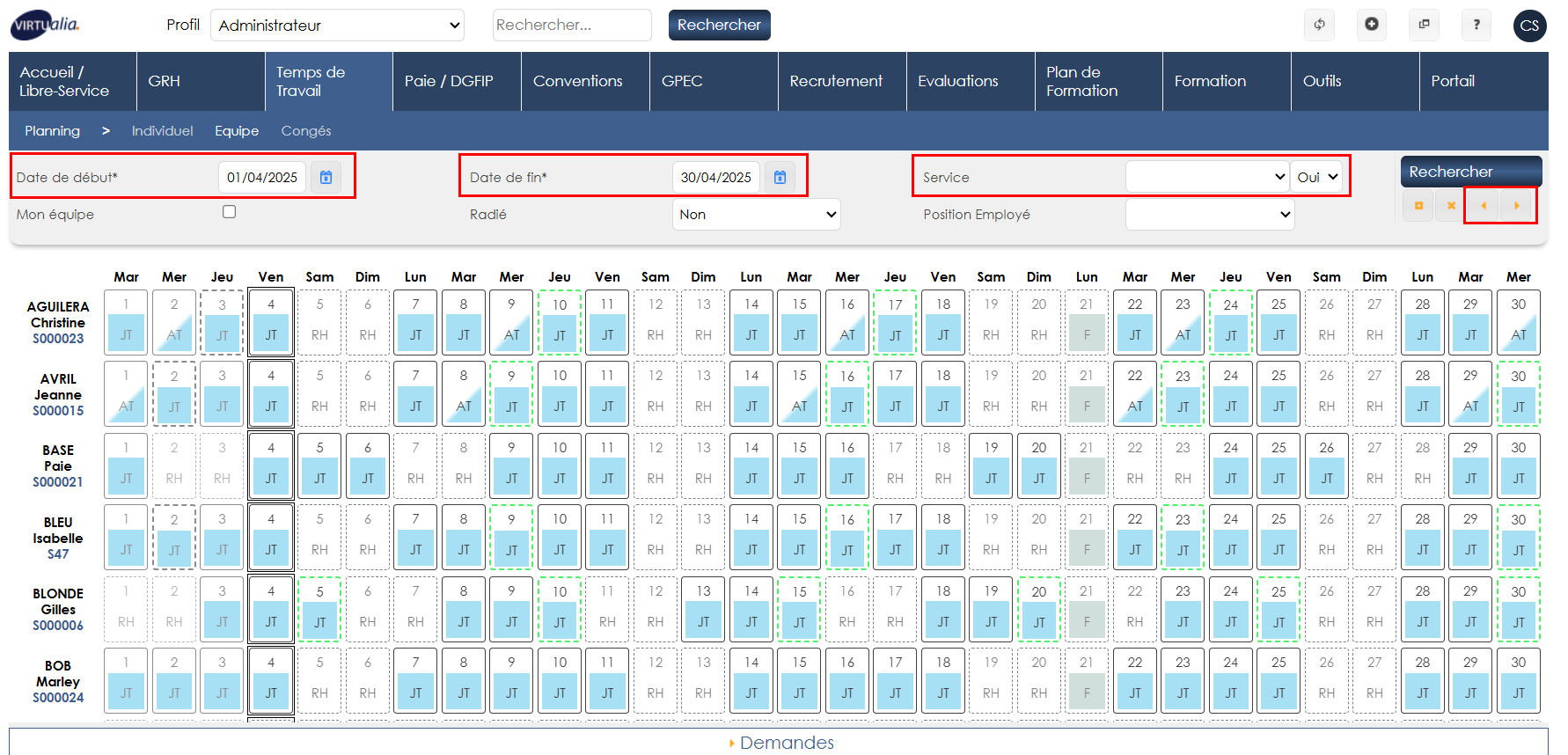 Il est possible de filtrer par services, par les agents étant dans une position “employé”, ou de passer d’un mois à l’autre avec les flèches sous “rechercher”.