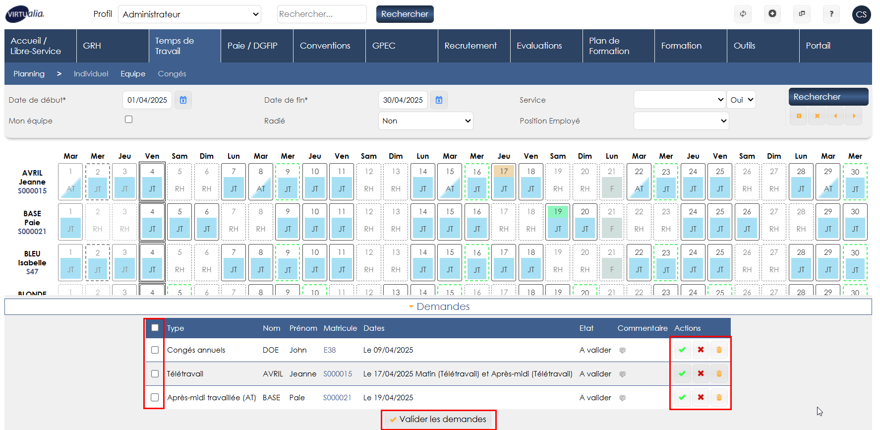 Soit en cochant les demandes à gauche puis en cliquant sur “Valider les demandes” ou en utilisant les boutons actions à droite des absences (valider, refuser ou annuler).