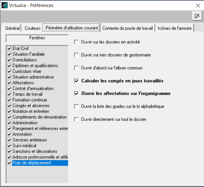 - Périmètre d’utilisation courant : permet d’enlever/d’ajouter les onglets non utilisés dans fenêtre + de gérer les paramètres globaux (cf : ci-dessous)