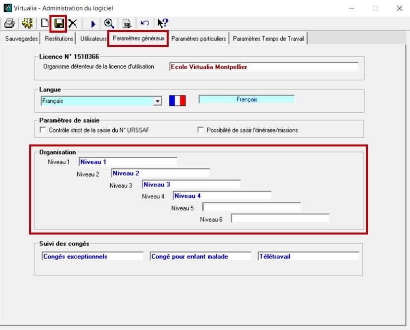 Dans le menu Outils > Administrer le logiciel > Paramètres généraux, saisissez le nom du nouveau niveau puis enregistrez 💾.