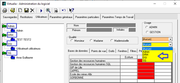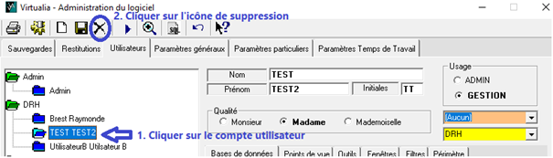 Pour supprimer le compte de l’utilisateur TEST TEST2, vous devez vous rendez dans Outils > Administrer le logiciel > Utilisateurs
