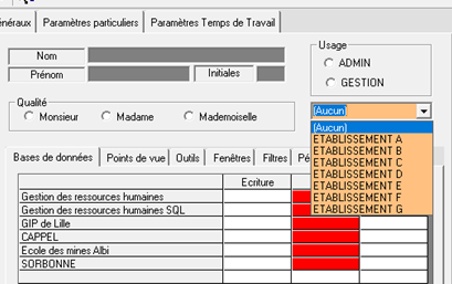 - Unité de gestion : L’utilisateur n’a accès qu’à un certain nombre de dossiers conformément aux critères cochés.